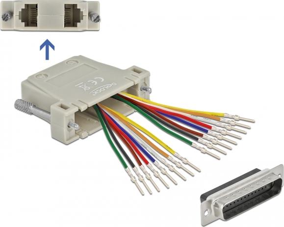 Mit diesem HD (High Density) Adapter von Delock kann eine serielle Schnittstelle über zwei optionale Netzwerkkabel erweitert werden. Dabei kann die Pinbelegung individuell eingerichtet werden. Dazu werden die Kabelenden in das gewünschte Loch am Konnektor gesteckt und im Gehäuse eingerastet.