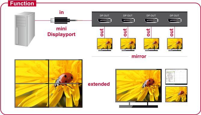 Dieser Splitter von Delock erhält ein Displayport Signal von einem PC oder Notebook und teilt es auf vier angeschlossene Bildschirme auf. Somit können an einem Displayport Anschluss vier Displayport Monitore betrieben werden. Die Ausgänge sind Dual Mode fähig (DP++), so können alternativ auch HDMI oder DVI Monitore mit entsprechenden Adaptern angeschlossen werden.