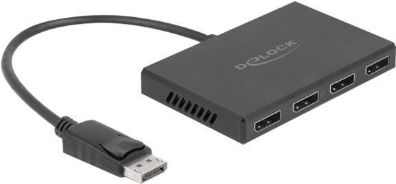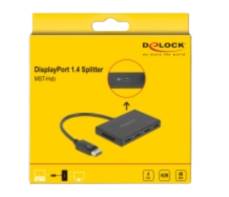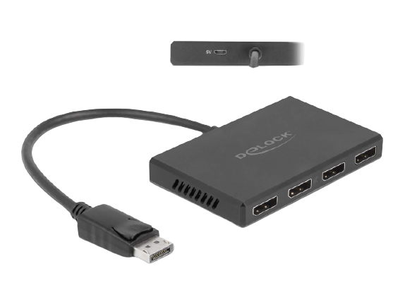 Dieser Splitter von Delock erhält ein DisplayPort Signal von einem PC oder Notebook und teilt es auf vier angeschlossene Bildschirme auf. Somit können an einem DisplayPort Anschluss vier DisplayPort Monitore betrieben werden.