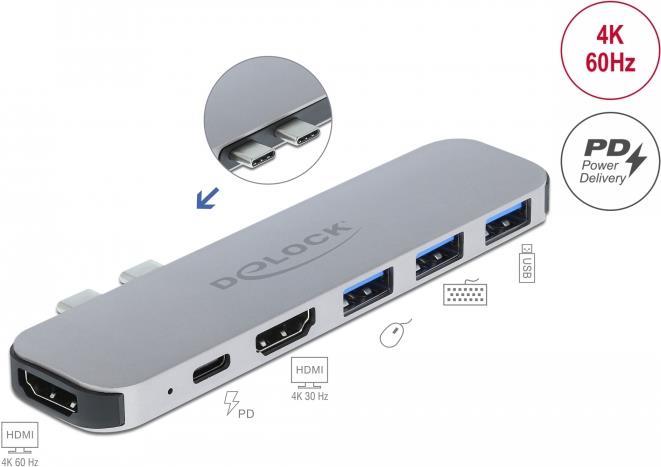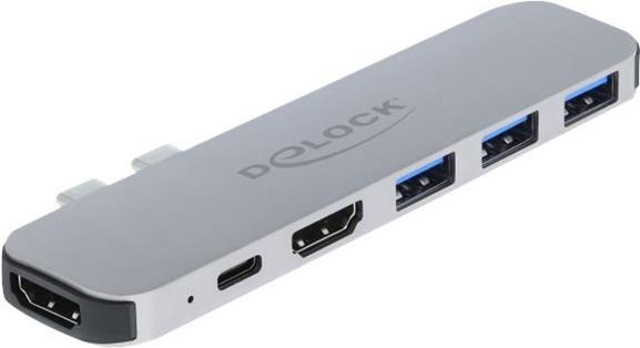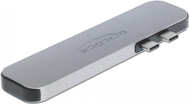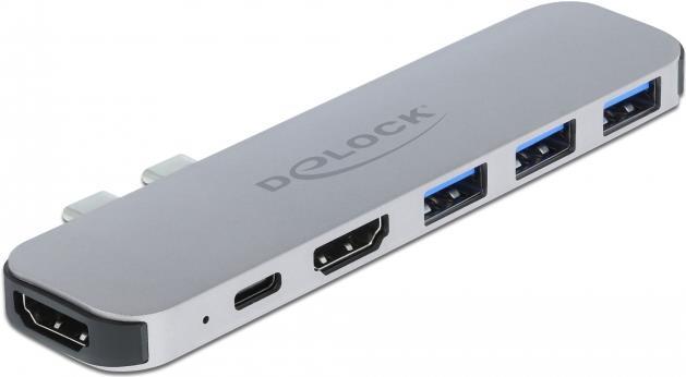Diese Dockingstation von Delock kann an ein MacBook mit zwei nebeneinanderliegenden Thunderbolt 3 Ports, z. B. am MacBook Pro, angeschlossen werden. An den HDMI Ausgängen können gleichzeitig zwei Monitore betrieben werden. Drei integrierte USB Typ-A Ports ermöglichen die Verwendung von Peripheriegeräten. Mit einem USB-C Netzteil kann das MacBook während des Betriebs geladen werden.