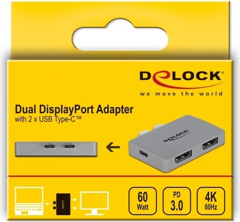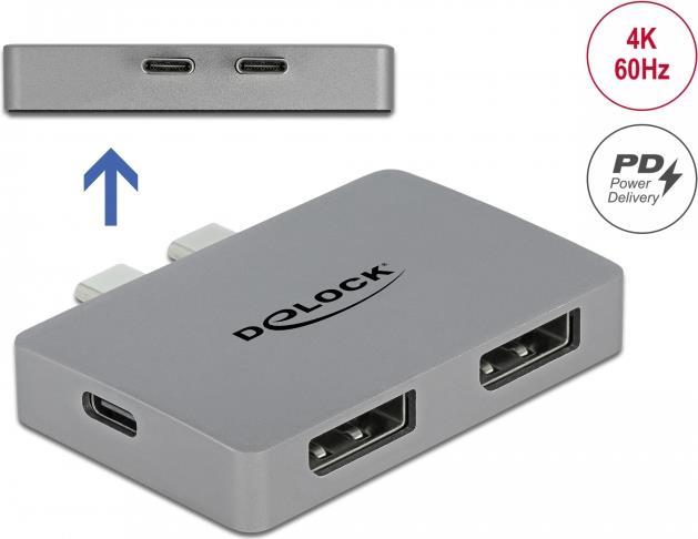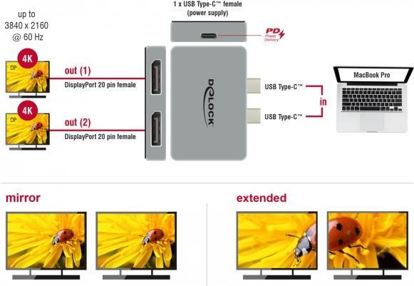 Dieser Adapter von Delock kann an ein MacBook mit zwei nebeneinander liegenden Thunderbolt 3 Ports, z. B. am MacBook Pro, angeschlossen werden. An den DisplayPort Ausgängen können zwei Monitore gleichzeitig mit 4K 60 Hz betrieben werden.