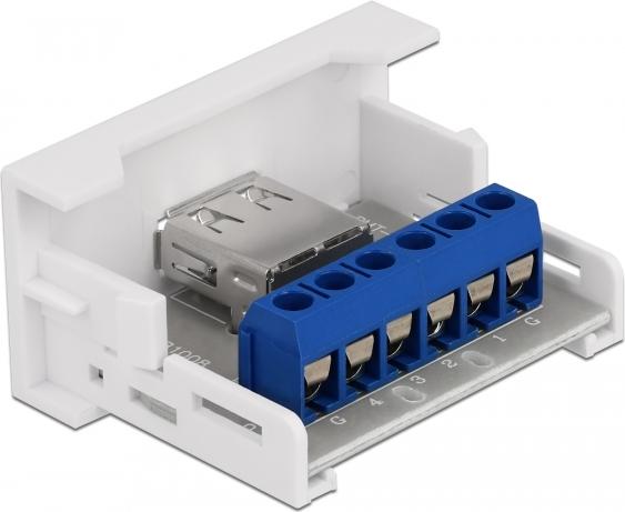 Dieses Easy 45 Modul von Delock stellt eine USB 2.0 Typ-A Buchse zur Verfügung. Durch den einfachen Einrastmechanismus sitzt das Modul fest an seinem Platz und lässt sich bei Bedarf problemlos entfernen.