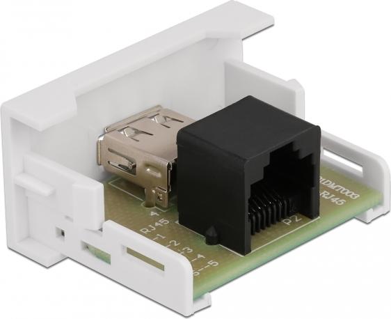 Dieses Easy 45 Modul von Delock stellt eine USB 2.0 Typ-A Buchse zur Verfügung. Durch den einfachen Einrastmechanismus sitzt das Modul fest an seinem Platz und lässt sich bei Bedarf problemlos entfernen. An die RJ45 Buchse kann z. B. ein bereits verlegtes Netzwerkkabel angeschlossen und verlängert werden.