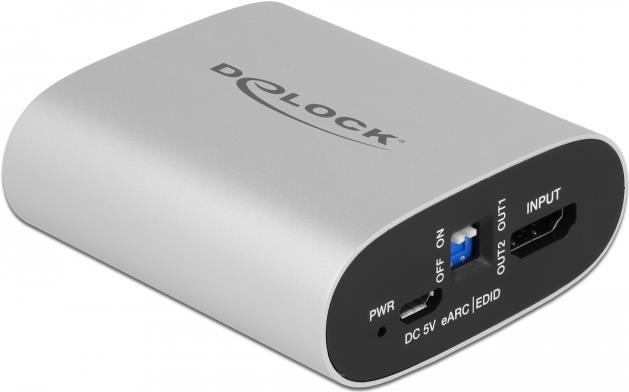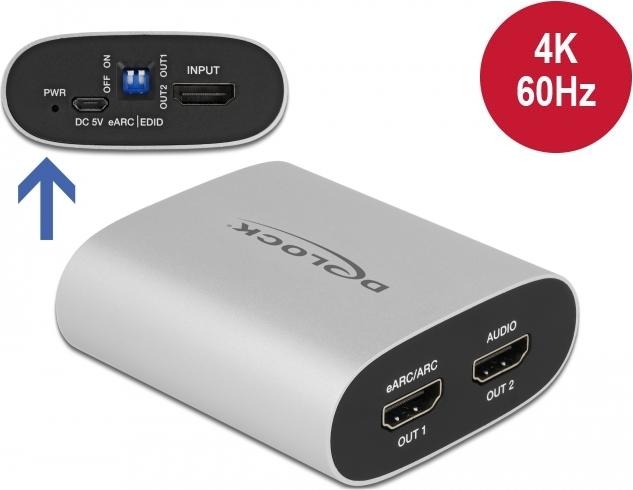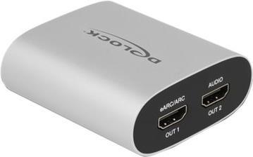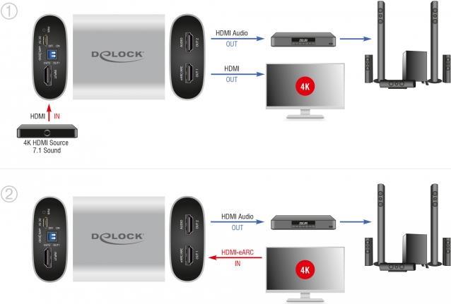 Mit diesem Adapter von Delock kann aus einer HDMI Übertragung das Audiosignal ausgekoppelt werden. Während das Bildsignal auf einem TV oder Monitor dargestellt wird, kann das Audiosignal über den zweiten HDMI Anschluss an einen Surround Receiver ausgegeben werden. Damit kann ein vorhandener AV-Receiver oder eine Soundbar weiterhin genutzt werden, auch wenn kein geeigneter Ultra-HD Anschluss vorhanden ist.