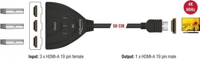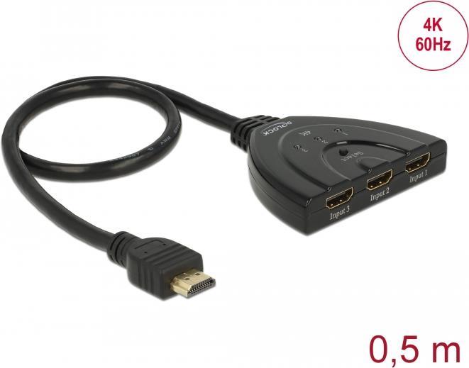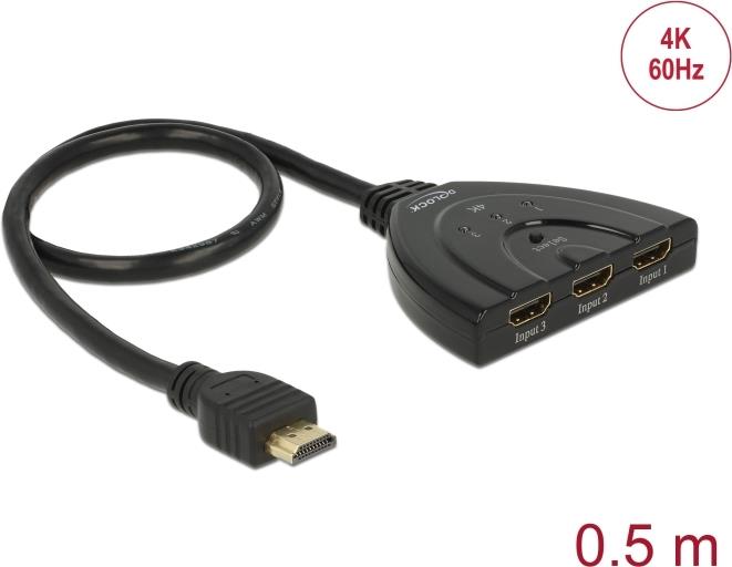 Delock HDMI UHD Switch 3 x HDMI in > 1 x HDMI out 4K mit integriertem Kabel 50 cm (18600)