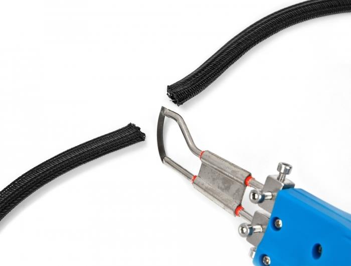 Dieses Heißschneidegerät von Delock wird zum Schneiden von z.B. Geflecht- und Gewebeschläuchen verwendet. Die einzelnen Fäden an der Schnittkante beim Geflechtschlauch fransen nicht aus, sondern schmelzen und hinterlassen einen sauberen Gesamteindruck.