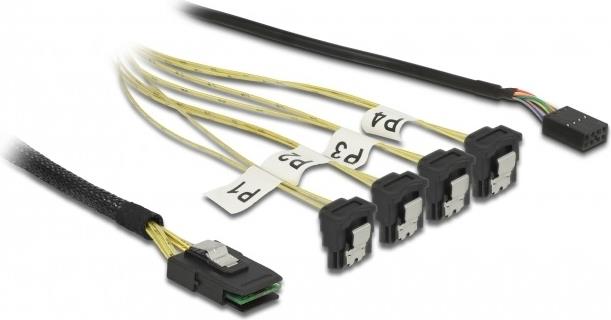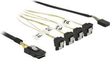 Dieses SAS Kabel von Delock kann zum internen Anschluss von verschiedenen SAS Geräten verwendet werden, z. B. von einem Kontroller mit Mini SAS Anschluss an 4 HDDs mit SATA Anschlüssen.