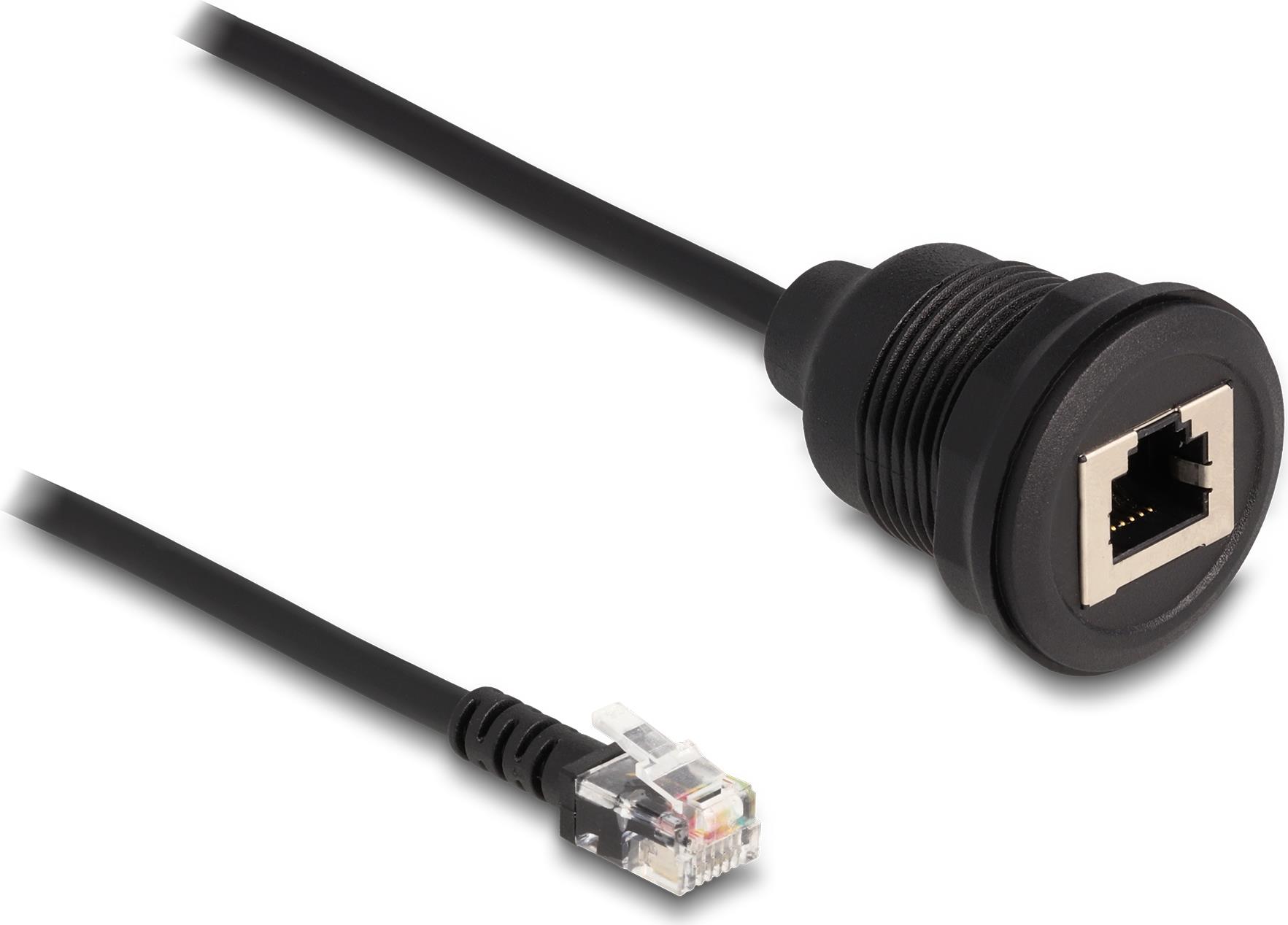 Dieses RJ12-Kabel von Delock kann zur Verlängerung und zum Anschluss eines Telefonkabels verwendet werden. Die eingebaute Buchse kann z.B. an einem Gehäuse mit einem entsprechenden Ausschnitt befestigt werden.