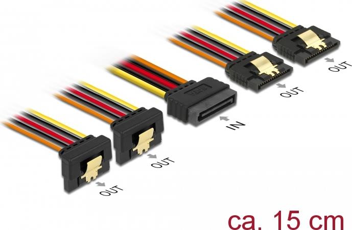 Dieses Kabel von Delock dient der Stromversorgung von vier SATA Geräten über einen freien SATA 15 Pin Stromanschluss des Netzteils. Durch die Metallclips an den Buchsen und die Metallclip-Aufnahme am Stecker wird ein zusätzliches Einrasten beim Anschließen des Kabels ermöglicht.
