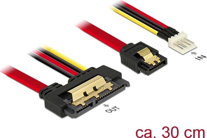 Dieses Kabel von Delock dient dem Anschluss eines Gerätes mit 22 Pin SATA Schnittstelle über einen freien SATA 7 Pin Port sowie einen freien 4 Pin Molex Stromanschluss des Netzteils. Die Metallclips an den SATA Buchsen sorgen dafür, dass die Kabel zuverlässig einrasten.