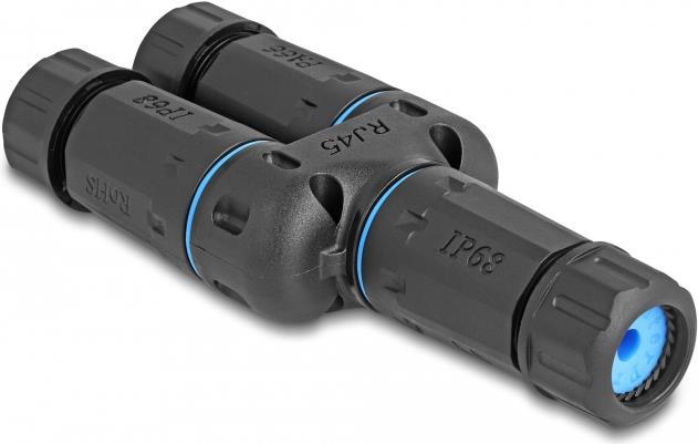 Dieser Kabelstecker von Delock verbindet RJ45-Netzwerkkabel und ist ideal für den Außeneinsatz im Garten.