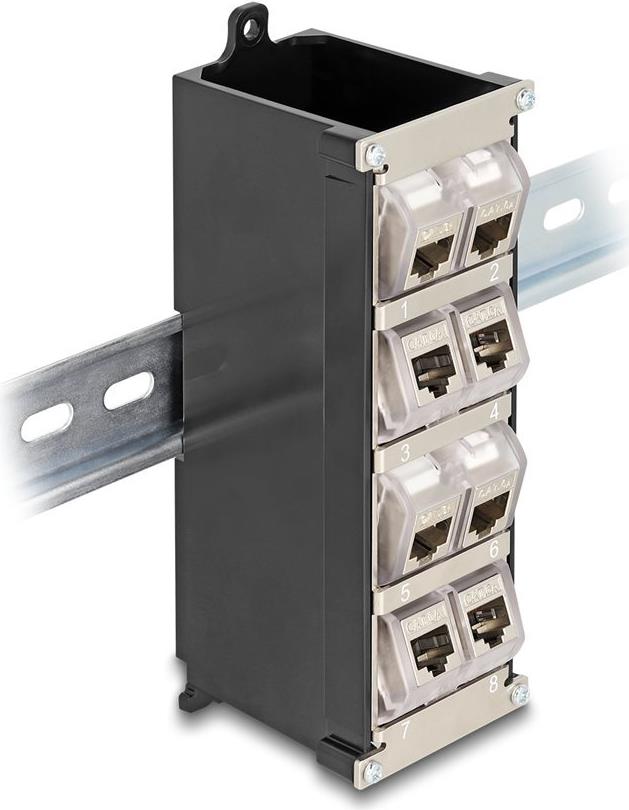 Der modulare Einsatzhalter von Delock verfügt über ein praktisches Design mit 8 Anschlüssen und ist damit eine Lösung für verschiedene Netzwerkanforderungen. Sein Keystone-Typ ermöglicht eine einfache Anpassung und Kompatibilität mit einer Vielzahl von Keystone-Modulen. Dieser Halter ist aus strapazierfähigem Kunststoff und Metall gefertigt und gewährleistet Langlebigkeit und Stabilität in verschiedenen Umgebungen. Mit seinem um 30° neigbaren Design bietet er Flexibilität für vertikale und horizontale Montagepositionen und erfüllt damit vielfältige Installationsanforderungen. Die Installation ist dank des mitgelieferten Erdungskabels und des Befestigungsmaterials ganz einfach. Der Halter kann an der Wand oder auf einer DIN-Schiene montiert werden und eignet sich somit für verschiedene Aufstellungen. Darüber hinaus ist der Halter für Betriebstemperaturen von -10 °C bis 60 °C ausgelegt und gewährleistet somit auch unter schwierigen Bedingungen eine einwandfreie Funktion. Nummerierte Anschlüsse sorgen für eine übersichtliche Organisation, und der Halter ist für Keystone-Module mit einer Größe von bis zu 19,2 x 14,9 mm ausgelegt, was eine effiziente und ordentliche Einrichtung ermöglicht.