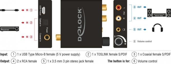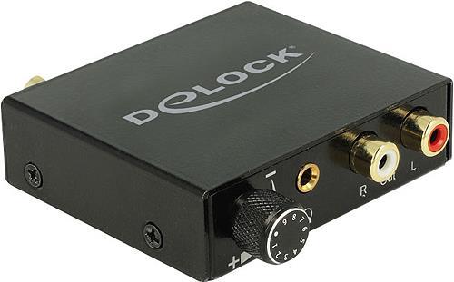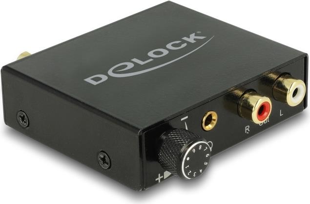 Der Digital Audio Konverter (DAC) von Delock wandelt ein digitales Audiosignal in ein analoges Stereosignal um. Am Eingang des Gerätes kann z.B. ein DVD oder Blu-ray Player angeschlossen und das Signal entweder optisch über TOSLINK oder per S/PDIF Koaxialverbindung eingespeist werden. Am Ausgang wird das Audiosignal per Cinch zum analogen Gerät ausgegeben. Zusätzlich ist ein Kopfhöreranschluss und ein Lautstärkeregler integriert.