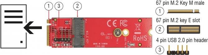 Dieser Konverter von Delock wandelt den M.2 Key M Slot in einen Key E Slot um. Es werden Module mit USB und PCIe Signalübertragung unterstützt.