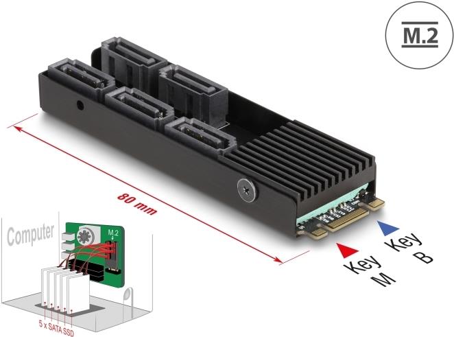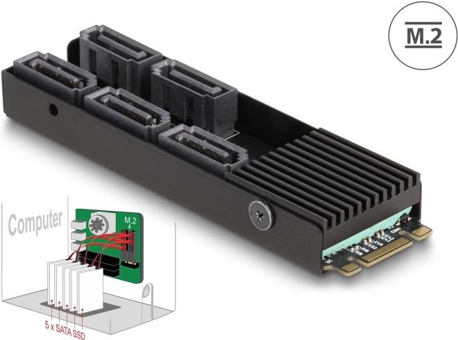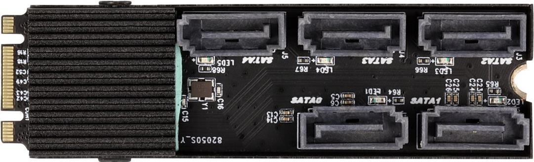 Dieser Konverter von Delock erweitert das System um fünf SATA-Ports. An den Konverter können verschiedene Geräte wie SSDs, Festplatten, DVD-Laufwerke etc. angeschlossen werden. Der Kühlkörper um das M.2-Modul sorgt für eine optimale Temperatur im Betrieb.