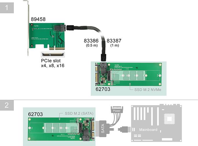 An diesen Delock Konverter kann eine M.2 NGFF SSD im 2280, 2260, 2242 und 2230 Format angeschlossen werden. Er ermöglicht die Nutzung einer M.2 SSD auf PCIe oder SATA Basis. Der Konverter kann intern über die SATA Schnittstelle in das System eingebunden werden, bei Nutzung einer SATA M.2 SSD, oder über die SFF-8643 Schnittstelle, bei Nutzung einer PCIe M.2 SSD.