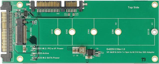 An diesen Delock Konverter kann eine M.2 SSD im 22110, 2280, 2260, 2242 und 2230 Format angeschlossen werden. Er ermöglicht die Nutzung einer M.2 SSD auf PCIe oder SATA Basis. Der Konverter kann intern über die SATA Schnittstelle in das System eingebunden werden, bei Nutzung einer SATA M.2 SSD, oder über die U.2 Schnittstelle, bei Nutzung einer PCIe M.2 SSD.