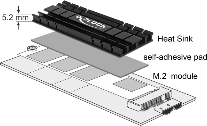 Dieser Kühlkörper von Delock dient der Wärmeableitung des M.2 Moduls und kann mit Hilfe der beiliegenden selbstklebenden Wärmepads auf einem M.2 Modul befestigt werden.
