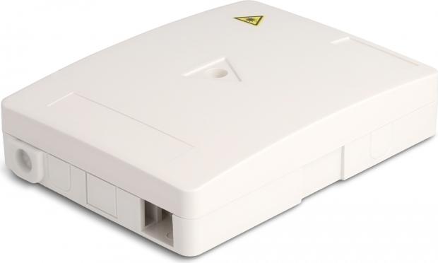 Diese LWL Anschlussdose von Delock eignet sich für die Wandmontage und ermöglicht die Aufnahme von bis zu zwei SC Simplex oder LC Duplex Kupplungen.