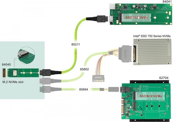 Dieser Konverter von Delock erweitert das System um einen SFF-8612 Anschluss. An diesen Port kann z. B. eine SSD, mit Hilfe eines optionalen Kabels, angeschlossen werden. Der Konverter überträgt PCI Express Signale und verwendet dazu das NVMe Protokoll.