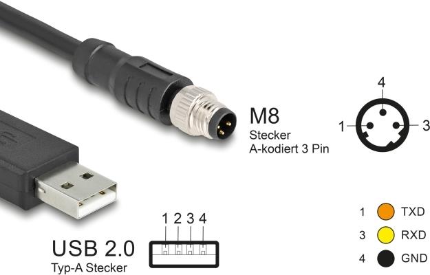 Dieses Serielle USB 2.0 zu M8 RS-232 Kabel von Delock eignet sich für die industrielle Anwendung z. B. bei Sensoren und Automatisierungsmodulen.Hauptmerkmale