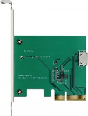 Diese PCI Express Karte von Delock erweitert den PC um einen SFF-8612 Anschluss. An diesen Port kann z. B. eine SSD, mit Hilfe eines optionalen Kabels, angeschlossen werden. Die Karte überträgt PCI Express Signale und verwendet dazu das NVMe Protokoll.