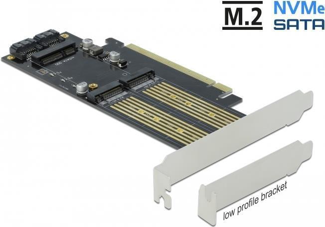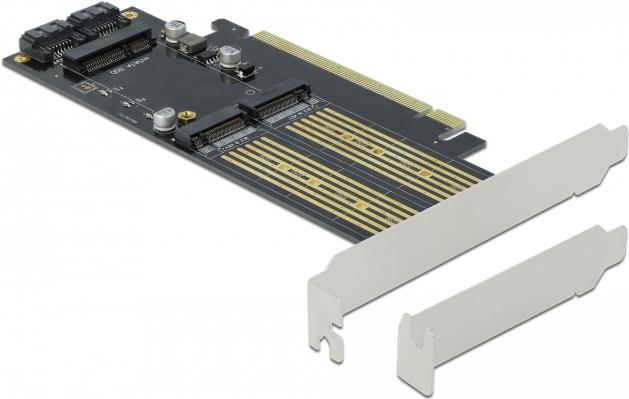 Diese PCI Express Karte von Delock erweitert den PC um zwei M.2 Slots, sowie einen mSATA Slot. An dieser Karte kann ein M.2 SATA Modul im 2280, 2260, 2242, 2230 Format angeschlossen und per SATA Kabel mit dem Mainboard verbunden werden. Weiterhin kann ein M.2 NVMe / PCIe Modul im 2280, 2260, 2242, 2230 Format angeschlossen werden. Zusätzlich kann ein mSATA Speicher angeschlossen und per SATA Kabel mit dem Mainboard verbunden werden. Alle Slots sind einzeln oder gleichzeitig nutzbar.