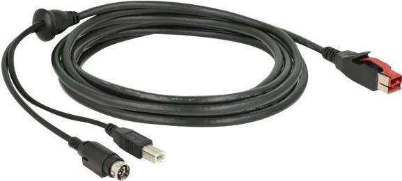 Dieses PoweredUSB Kabel von Delock dient dem Anschluss eines Geräts mit USB Typ-B Buchse und Hosiden Mini-DIN 3 Pin Strombuchse an einen PC oder Hub mit PoweredUSB 24 V Buchse. Es eignet sich zur Anbindung von verschiedenen POS Geräten wie Druckern und Terminals, z. B. von Epson oder Toshiba. Das Kabel dient sowohl der Datenübertragung als auch der Stromversorgung des angeschlossenen Geräts.