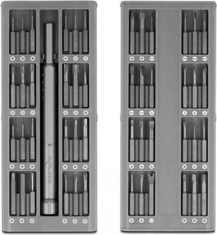 | Paketinhalt | 11 Schraubendreher-Bits - Torx T2/T3/T4/T5/T6/T7/T8/T9/T10/T15/T20, 3 screwdriver bits - square SQ1, SQ2, SQ3, Präzisionsschraubendreher-Griff, 9 screwdriver bits - hex 0.7, 0.9, 1.3, 1.5, 2, 2.5, 3, 3.5, 4 mm, 6 Schraubendreher-Bits - Schlitz 1, 1,5, 2, 2,5, 3, 3,5 mm, 6 screwdriver bits - phillips PH1, PH1.5, PH2, PH2.5, PH3, PH3.5, 4 screwdriver bits - tri-wing Y0.8; Y2.0; Y2.5; Y3.0, 4 screwdriver bits - pentalobe 0.8, 1.2, 1.5, 2 mm, 3 screwdriver bits - triangle TA2.0, TA2.3, TA3.0, screwdriver bits - U form U2.6, screwdriver bit - standoff 1.5 mm |