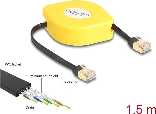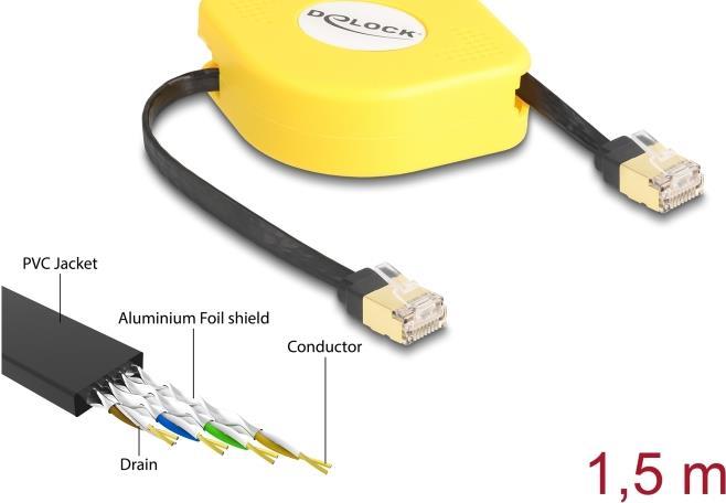Delock - Netzwerkkabel - RJ-45 (M) zu RJ-45 (M) - 1,5m - STP - CAT 6a - geformt, flach, einziehbar - Schwarz (80239)