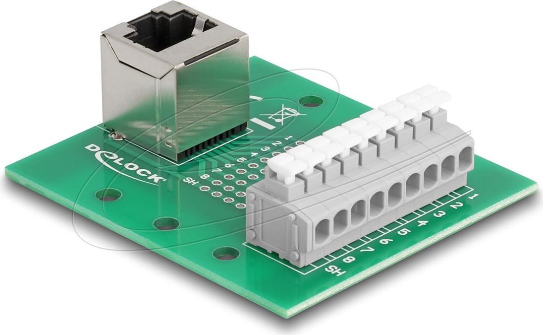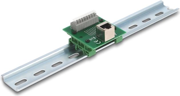 Delock RJ45 Buchse zu Terminalblock mit Drucktaster für Hutschiene gewinkelt (66993)