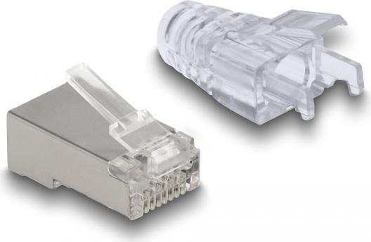 Dieses hochwertige RJ45 Stecker Set von Delock beinhaltet geschirmte RJ45 Stecker mit vorderer Öffnung und passenden Knickschutztüllen, um Verlegekabel von 26 - 23 AWG optimal zu konfektionieren.