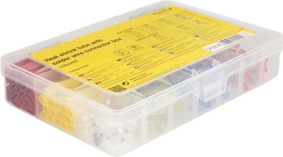 80 x brown heat shrink tube (2 mm x 50 mm / shrinkage ratio 2:1), 35 x green heat shrink tube (4 mm x 50 mm / shrinkage ratio 2:1), 16 x yellow heat shrink tube (6 mm x 50 mm / shrinkage ratio 2:1), 25 x red heat shrink tube (8 mm x 50 mm / shrinkage ratio 2:1), 15 x blue heat shrink tube (13 mm x 50 mm / shrinkage ratio 2:1), 12 x white heat shrink tube (18 mm x 50 mm / shrinkage ratio 2:1), 50 x transparent solder wire connectors (AWG: 26 - 24), 40 x red solder wire connectors (AWG: 22 - 18), 20 x blue solder wire connectors (AWG: 16 - 14), 15 x yellow solder wire connectors (AWG: 12 - 10)