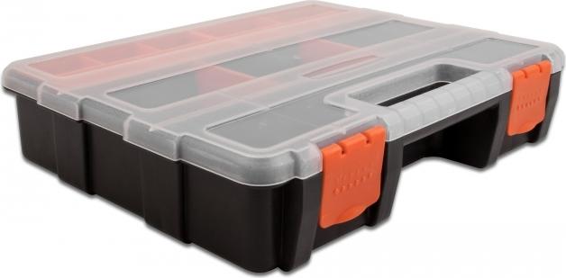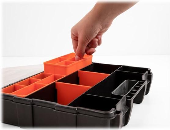Durch Umsetzen der Trennwände in der Mitte der Sortimentsbox kann die Größe der einzelnen Fächer individuell verstellt werden. Zwei kleinere Boxen mit je 5 Fächern im hinteren Teil können herausgenommen werden und schaffen weiteren Platz, um mehrere Gegenstände zu verstauen.