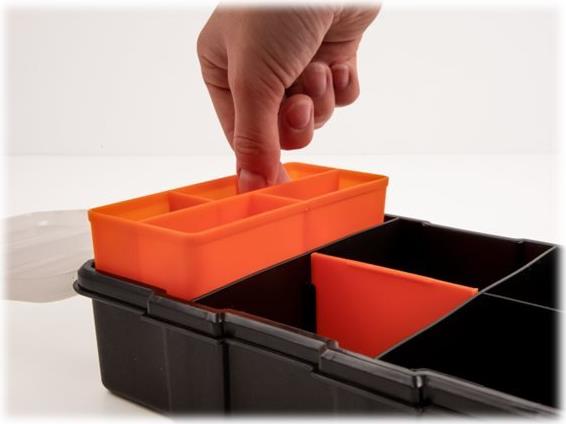 Durch Umsetzen der Trennwand in der Mitte der Sortimentsbox kann die Größe der einzelnen Fächer individuell verstellt werden. Eine kleinere Box mit je 5 Fächern im hinteren Teil kann herausgenommen werden und schafft weiteren Platz, um mehrere Gegenstände zu verstauen.