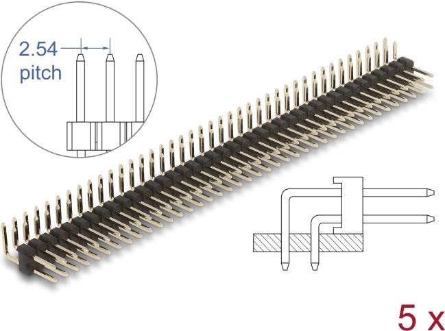 Delock Stiftleiste 40 Pin, Rastermaß 2,54 mm, 2-reihig, gewinkelt, 5 Stück (66703)