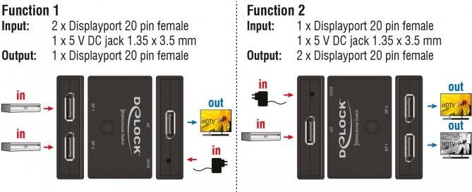 Dieser Displayport-Umschalter von Delock ist ein manueller bidirektionaler Umschalter zur Verbindung verschiedener Geräte mit Displayport-Anschluss, der zwei verschiedene Einsatzmöglichkeiten bietet.