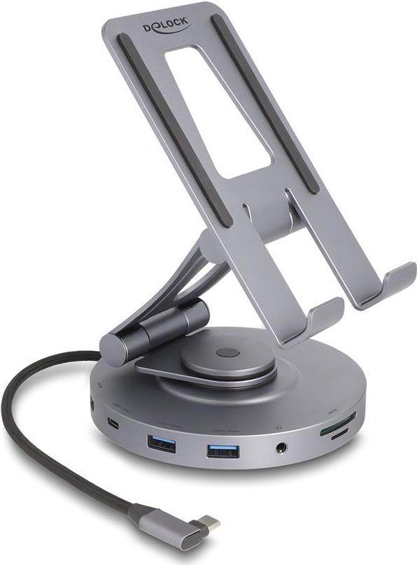 Entdecken Sie eine Lösung zur Erweiterung der Anschlussmöglichkeiten Ihres Geräts mit der Delock Docking Station. Dieses Zubehörteil dient als Dockingstation und kann auch als Tablet-Ständer verwendet werden, wodurch es für Laptop- und Tablet-Nutzer geeignet ist. Mit ihrem integrierten USB-C-Kabel und einer Vielzahl von Anschlüssen, darunter SuperSpeed USB 3.0, HDMI und eine Kopfhörer-/Mikrofon-Kombibuchse, bietet sie umfassende Konnektivitätsoptionen. Egal, ob Sie hochauflösende Bildschirme anschließen, Ihr Gerät aufladen oder einfach Ihre Anschlussmöglichkeiten erweitern möchten, diese Dockingstation erfüllt Ihre Anforderungen. Ihr kompaktes Design mit einem Metallgehäuse und Gummipuffern sorgt für Langlebigkeit und bietet mit ihrer 360°-Drehfunktion Flexibilität. Darüber hinaus unterstützt sie HDCP für die Anzeige geschützter Inhalte, DisplayPort Alt Mode und ist mit Samsung DeX kompatibel, um Ihr Multimedia-Erlebnis zu verbessern. Er ist ideal für Notebooks bis zu 14" und ist ein geeigneter Begleiter für Arbeit und Freizeit.