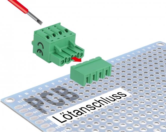 Dieses Terminalblock Set von Delock wird auf eine Platine aufgelötet, um eine lösbare Verbindung zwischen zwei Komponenten herzustellen.