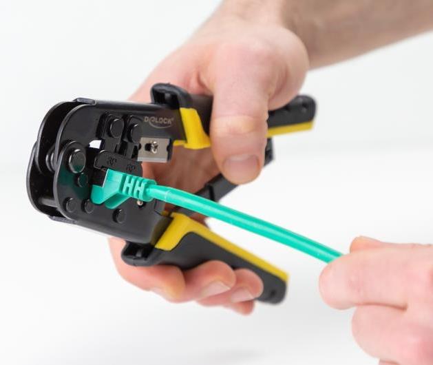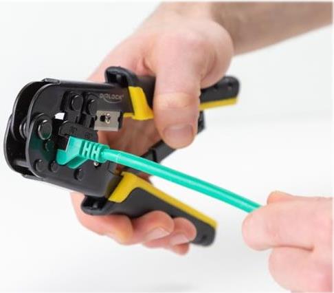Mit diesem Werkzeug von Delock kann schnell und einfach ein Netzwerkkabel mit einem Konnektor verbunden werden.