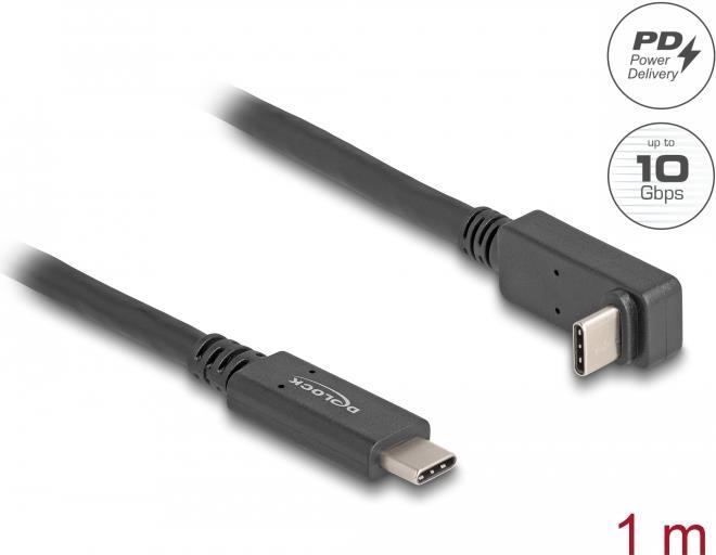 Delock - USB-Kabel - 24 pin USB-C (M) zu 24 pin USB-C (M) gewinkelt - USB 3,2 Gen 2 - 3 A - 1,0m - USB Power Delivery (60W), unterstützt 4K 144 Hz (3840 x 2160), bis zu 10 Gbps Datentransferrate, DP Alt Modus-Support, E-marker - Schwarz (80034)