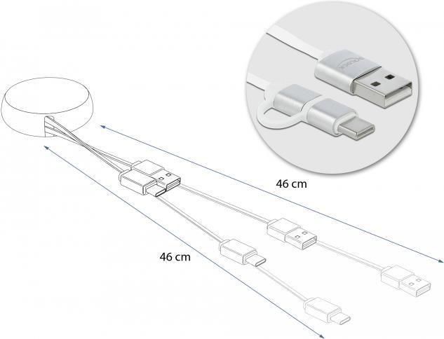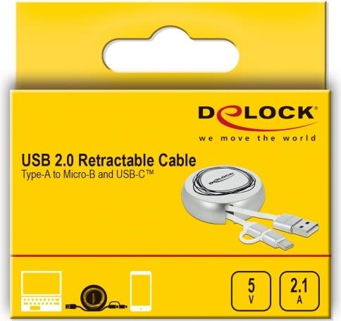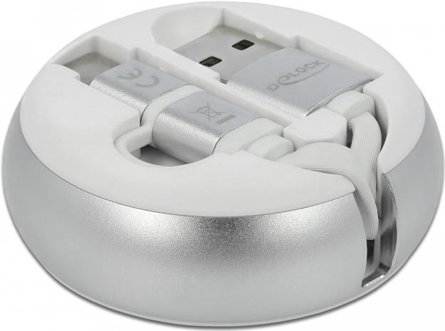 Dieses praktische Aufrollkabel von Delock kann an einen PC oder ein Notebook mit USB-A Anschluss angeschlossen werden und dient der Datenübertragung und dem Laden des angeschlossenen Geräts.