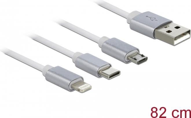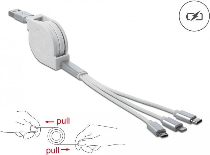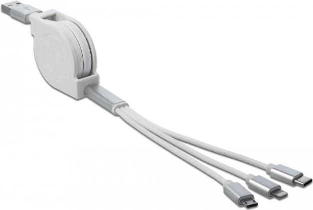 Dieses praktische 3 in 1 Aufrollkabel von Delock kann an eine Stromquelle mit USB-A Anschluss angeschlossen werden und dient zum Laden von diversen Geräten mit Lightning, Micro USB oder USB Type-C Schnittstelle. Ein Aufladen von drei Geräten gleichzeitig wird ebenfalls unterstützt, wobei sich die gesamte Ausgangsstromstärke von 2 A auf alle Leitungen verteilt.