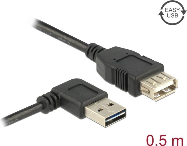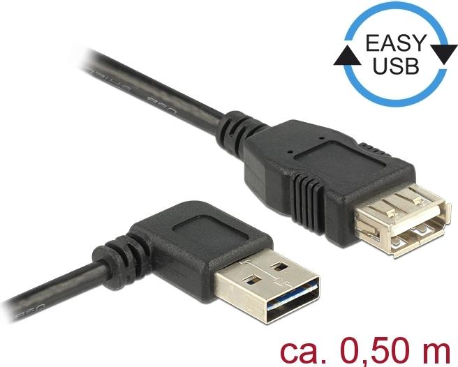 Delock Easy - USB-Verlängerungskabel - USB (M) links/rechts abgewinkelt, umkehrbar zu USB (W) - USB2.0 - 50cm - Schwarz (85177)