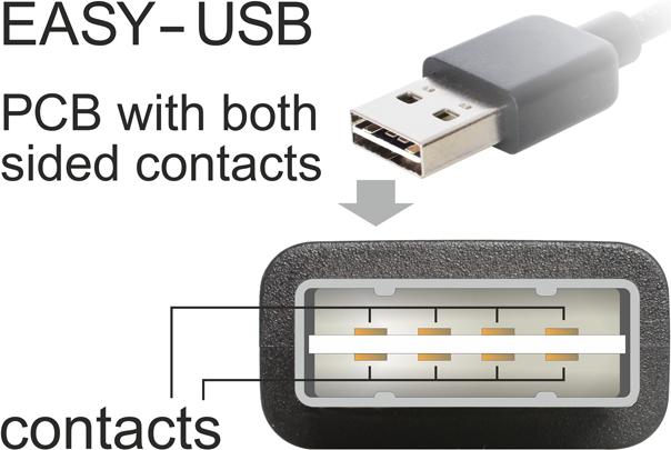 Dieses Kabel von Delock, mit EASY-USB Stecker, kann in beide Richtungen in die USB-A Buchse gesteckt werden. Somit kann der Stecker beidseitig verwendet werden und erleichtert das Einstecken.
