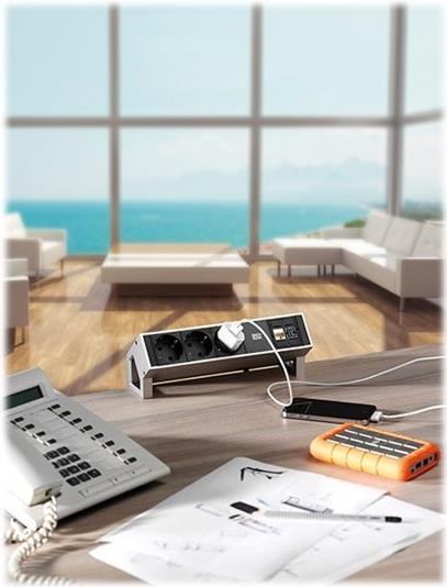 DESK Energieleisten sind Auftischeinheit für Arbeitsplätze mit Kombination aus Stromanschlüssen und Daten- oder Medientechnikmodulen.