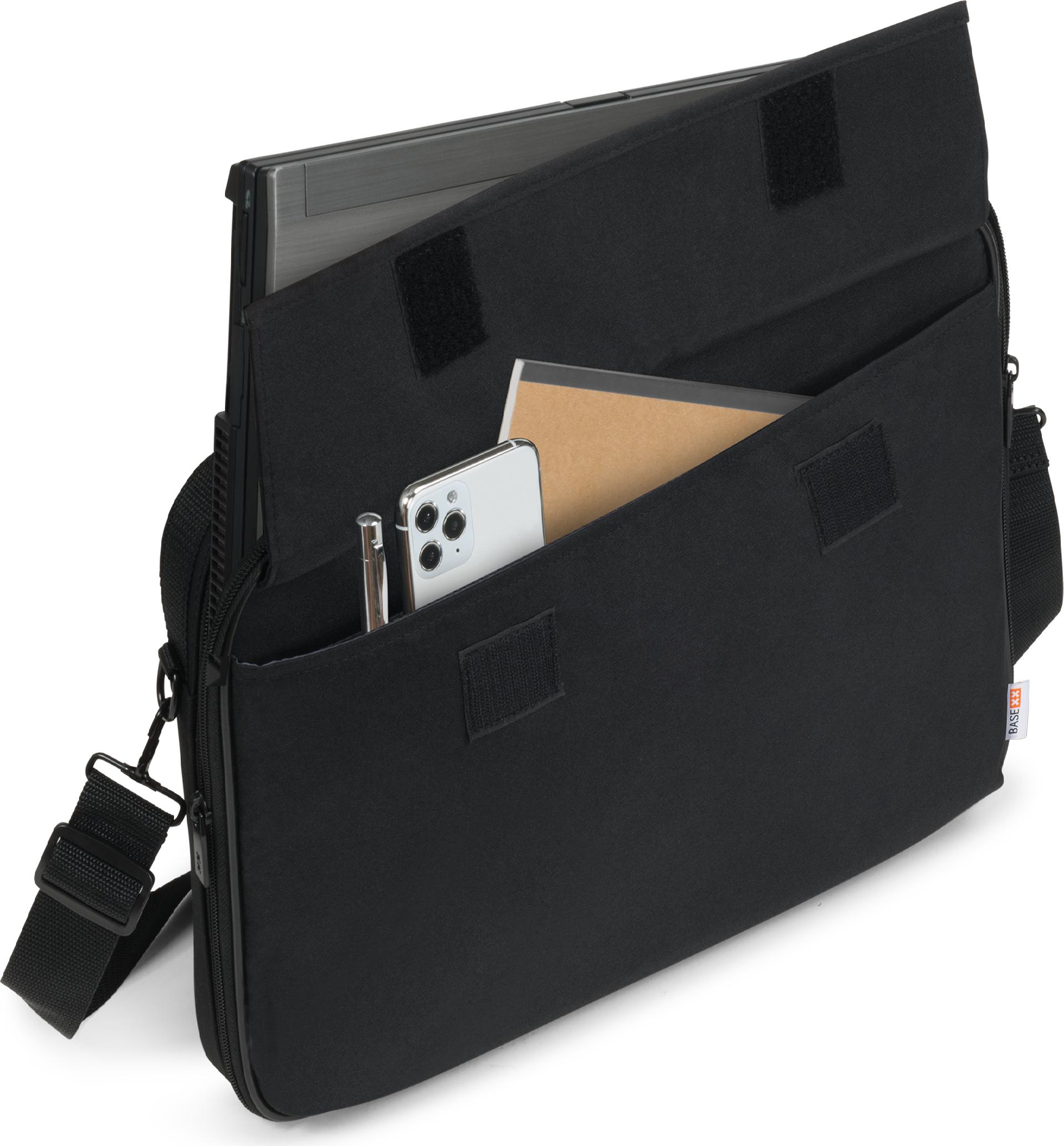 Mit der BASE XX Clamshell-Tasche kommt Ihr Notebook sicher ans Ziel. Das Hauptfach ist mit einer besonders guten Polsterung versehen, welche Ihr Gerät rundum vor Stößen und Schlägen schützt.Dabei sorgt ein Befestigungsriemen für sicheren Halt ohne Verrutschen. Das Hauptfach bietet zudem Stauraum für Dokumente und persönliche Gegenstände. In der Vordertasche mit integrierter Workstation haben Sie mobiles Zubehör wie Smartphone, Visitenkarten, Stifte, etc. stets griffbereit. Der längenverstellbare, abnehmbare Schultergurt und die Handgriffe bieten angenehmen Tragekomfort.