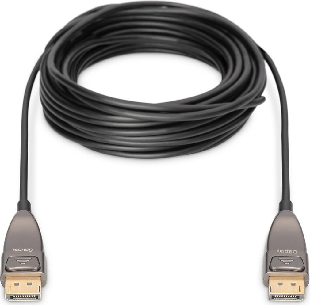 DIGITUS - DisplayPort-Kabel - DisplayPort (M) bis DisplayPort (M) - DisplayPort 1.4 - 10 m - Druckknopf, Active Optical Cable (AOC), Dolby DTS-HD Master Audio-Unterstützung, Dolby TrueHD-Unterstützung, FEC, Support von 4K 120 Hz, unterstützt 8K 60 Hz (7680 x 4320) - Schwarz