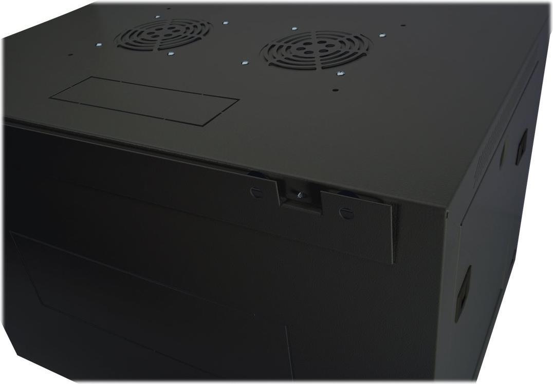 Die Netzwerkschränke zur Wandmontage der Dynamic Serie wurden für einen einfachen und besonders kostenoptimierten Netzwerkausbau entwickelt. Dach, Boden und Rückwand eines jeden Schrankes sind mit einem vorgestanzten Kabeleinlass ausgestattet. Für die Aufnahme eines Lüftermoduls wird das Dachchassis ebenfalls mit einem ausgestanzten Bereich versehen. Zwei Paar galvanisierte, mit in beide Richtungen ablesbare Höheneinheiten beschriftete 483 mm (19")-Profilschienen sind im Inneren verbaut. Diese lassen sich in der Tiefe verstellen. Jeder Schrank ist eine robuste Stahlkonstruktion aus bis zu 1,5 mm starkem Stahlblech. Die Farbgebung erfolgt in Form von elektrostatischer Pulverbeschichtung in den Standardfarben Grau (RAL 7035) und Schwarz (RAL 9005). Abnehmbare Seitenwände sowie die abschließ- und abnehmbare Fronttür, verbessern die Zugänglichkeit. Ein Türanschlagswechsel kann vorgenommen werden. Die Wandmontage erfolgt in zwei einfachen Arbeitsschritten: Das mitgelieferte Montageblech wird an die Wand geschraubt und im Anschluss mit dem Gehäuse verbunden.