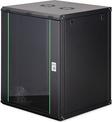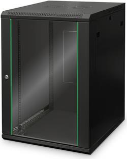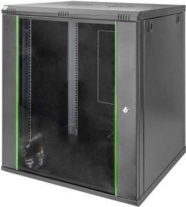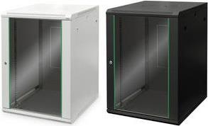 Die Netzwerkschränke zur Wandmontage der Dynamic Serie wurden für einen einfachen und besonders kostenoptimierten Netzwerkausbau entwickelt. Dach, Boden und Rückwand eines jeden Schrankes sind mit einem vorgestanzten Kabeleinlass ausgestattet. Für die Aufnahme eines Lüftermoduls wird das Dachchassis ebenfalls mit einem ausgestanzten Bereich versehen. Zwei Paar galvanisierte, mit in beide Richtungen ablesbare Höheneinheiten beschriftete 483 mm (19")-Profilschienen sind im Inneren verbaut. Diese lassen sich in der Tiefe verstellen. Jeder Schrank ist eine robuste Stahlkonstruktion aus bis zu 1,2 mm starkem Stahlblech. Die Farbgebung erfolgt in Form von elektrostatischer Pulverbeschichtung in den Standardfarben Grau (RAL 7035) und Schwarz (RAL 9005). Abnehmbare Seitenwände sowie die abschließ- und abnehmbare Fronttür, verbessern die Zugänglichkeit. Ein Türanschlagswechsel kann vorgenommen werden. Die Wandmontage erfolgt in zwei einfachen Arbeitsschritten: Das mitgelieferte Montageblech wird an die Wand geschraubt und im Anschluss mit dem Gehäuse verbunden.
